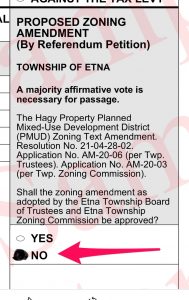 Look out for the developer and their supporters to try and confuse you. The husband of an Etna Township Zoning Commission Member created a PAC against our referendum. They sent our a deceptive postcard (paid for by the land owner). Now, The developer’s attorney has taken control of the PAC. The PAC has used names such as “Etna Residents for Responsible Growth”, “Etna Citizens for Responsible Growth”, and “Residents for Responsible Growth”.